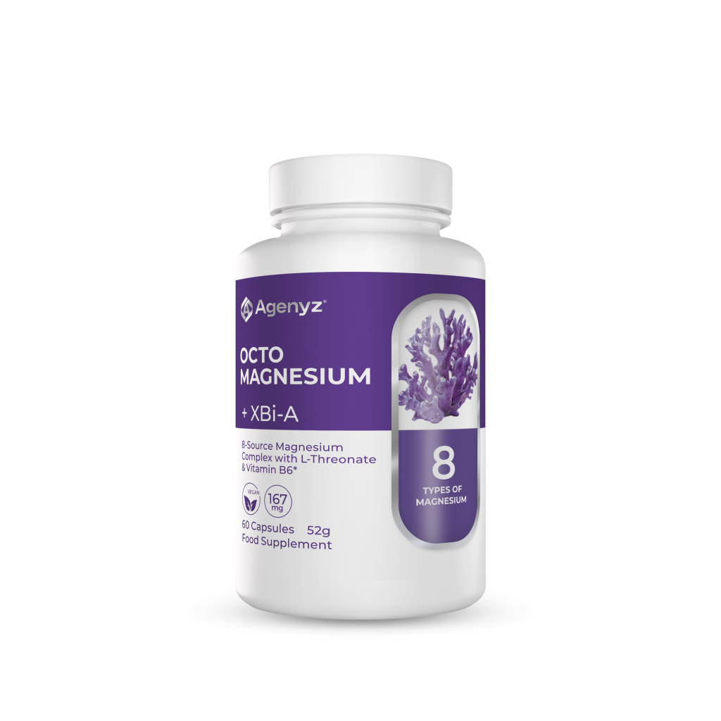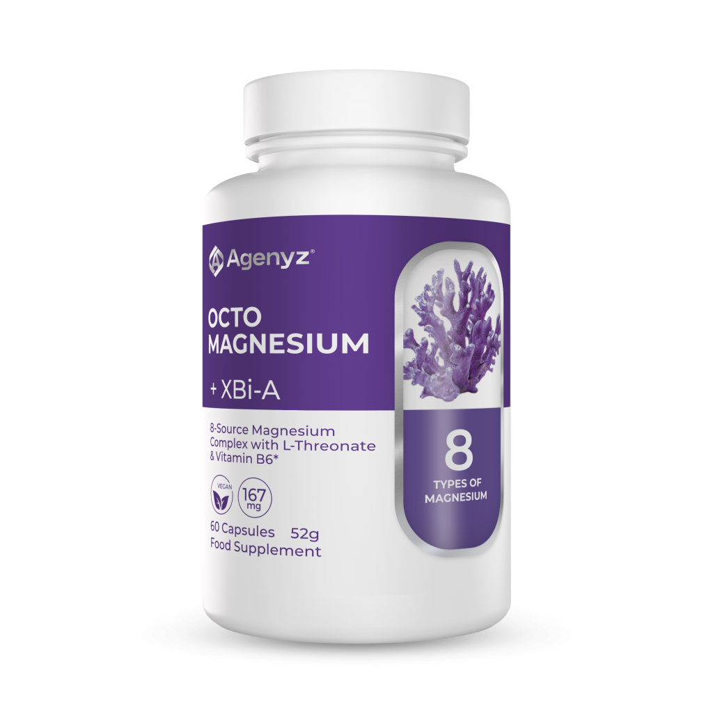 OCTOMAGNESIUM + XBi-A is a multi-source magnesium complex combining eight structurally distinct forms of magnesium with vitamin B6 and XBi-A. Each form is selected for its unique chemical structure and physiological role, creating a comprehensive spectrum that supports muscle relaxation, nerve signalling, energy production, cognitive function, bone health, and overall wellbeing. This combination ensures magnesium is available in ways that match the body’s diverse needs.